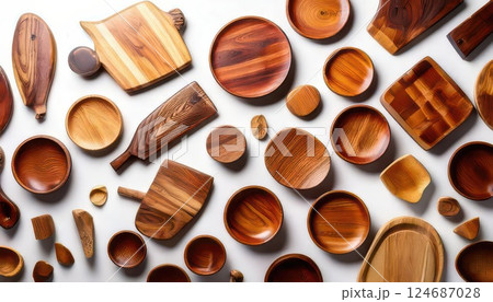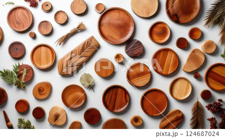 白い木製テーブルに置かれた木製の皿と木製カトラリー