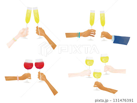 パーティで乾杯している手書きイラスト。祝日や記念日のお祝い。カクテルやお酒のグラス。