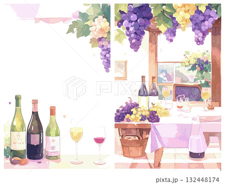 水彩風 ワイングラスとボトルと葡萄フレーム