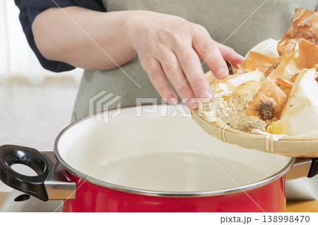 キッチンでベジブロスを作るシニア女性