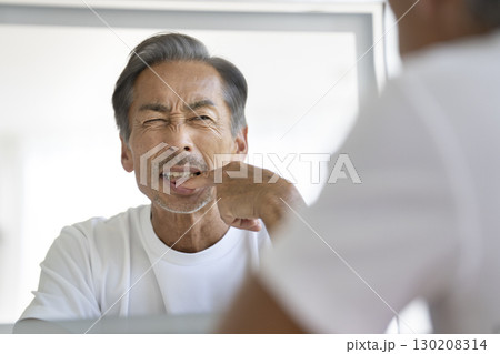 鏡を見て歯茎を気にするシニア男性