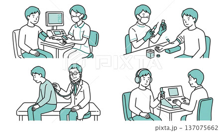 健康診断と医療検査のシーン イラスト素材 血圧測定 予防接種 聴診 聴力検査 線画 医療施設