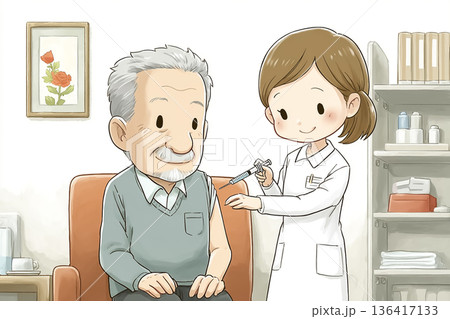シニア男性が安心してインフルエンザ予防接種を受ける医療イラスト
