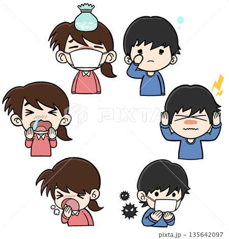 花粉症に関する症状や対策をする子どものイラストのセット_女児