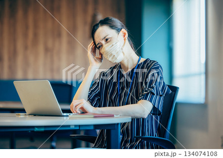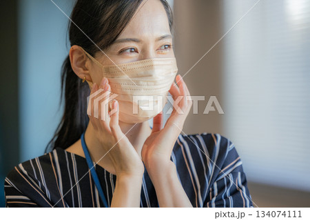 マスクをして辛そうに部屋でスマホを見るミドル〜シニア女性