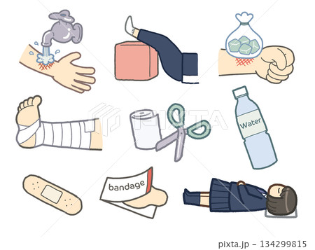 応急処置とケガ対策のイラスト素材セット(包帯・絆創膏・冷却・水分補給)