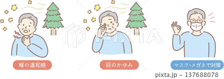花粉症の症状(目のかゆみ、喉の違和感)メガネ、マスクで対策_図解_高齢男性