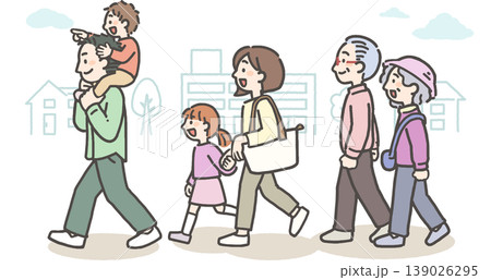 町で赤ちゃんが乗ったベビーカーを押すお母さんと、老夫婦と子ども
