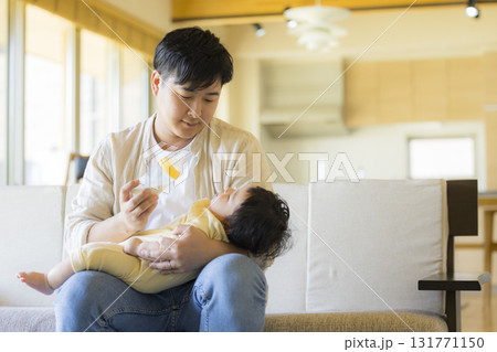 マイホームのソファーで赤ちゃんに哺乳瓶でミルクを飲む赤ちゃん,乳幼児
