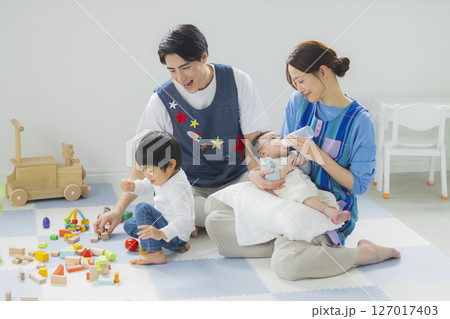 自宅のソファでくつろぐ家族,ファミリー,育児(育児休暇,育休)