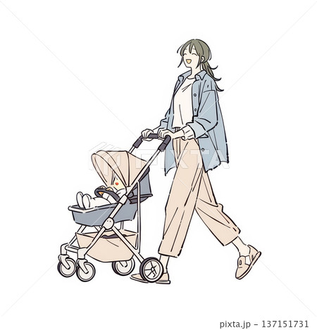 赤ちゃん乗せたベビーカーを押す女性のイラスト