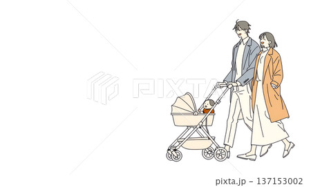 赤ちゃんを乗せたベビーカーを押す男女のイラスト