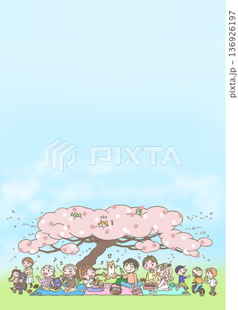 バナー フレーム アイソメトリック 人物 家族 子供 春 お花見 さくら 桜 背景 イラスト素材