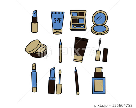 メイクアップアイテムの手描きイラストセット(ブルーベースカラー)