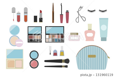 コスメのイラストセット-アイシャドウ、フェイスパウダー、リップスティック、マスカラ、ブラシ、香水など