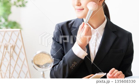鏡を見ながら化粧をするスーツ姿の若い女性
