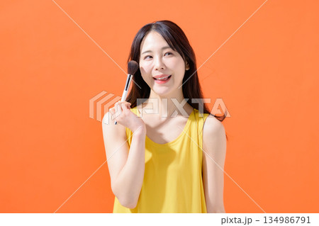 チークブラシ,フェイスブラシでメイクするアジア人女性
