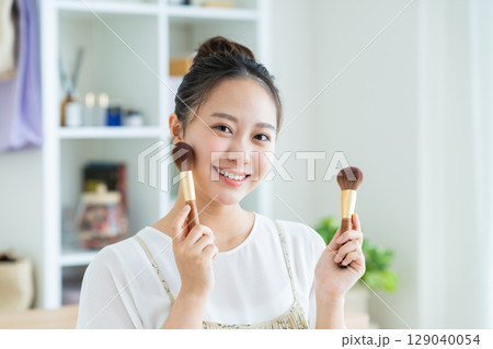 チークブラシ,フェイスブラシでメイクする若いアジア人女性