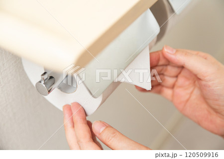 新しいトイレットペーパーを三角折りするミドル女性の手元