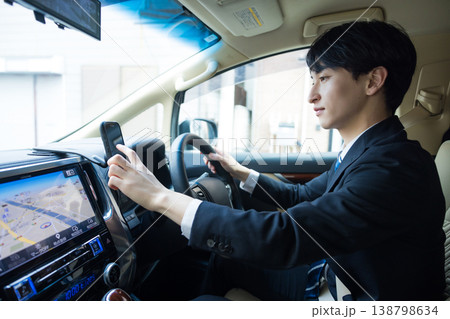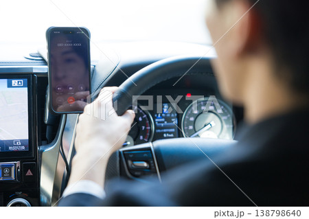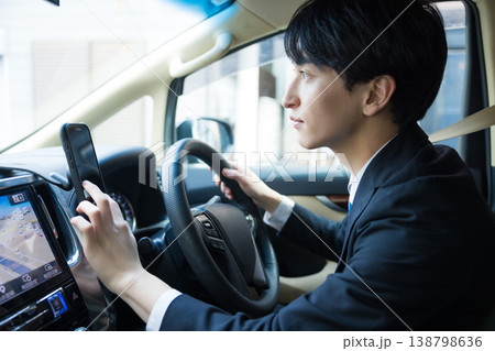 車を運転しながらスマホを操作するビジネスマン