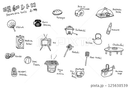 日本の夏の風物詩の手描き和風イラスト素材セット モノクロ