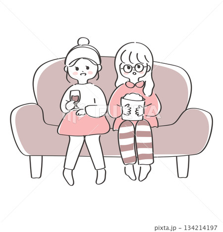 ソファーで映画鑑賞をする女性たちのかわいいイラスト