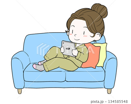 リラックスした雰囲気でパソコン作業をする女性、 自宅でテレワークをする女性のイラスト、 ナチュラルな