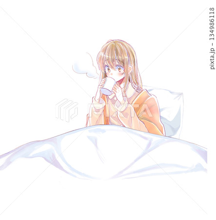 ベッドの上で温かい飲み物を飲む女性 パジャマ