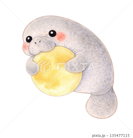 色鉛筆風の満月を抱くマナティのイラスト