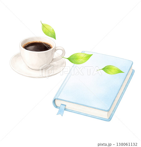 本とコーヒーと新緑の葉のシンプル素材 ナチュラル読書イメージ 白背景