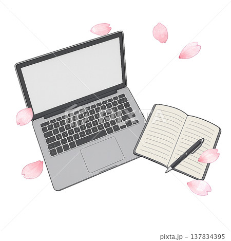 ノートパソコンとノート 学習 仕事 桜 春 作業 水彩イラスト素材