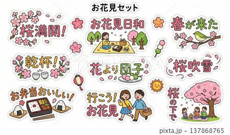 お花見 ステッカー風イラストセット 桜 春の行楽 弁当 団子 メッセージ入り 掲示物