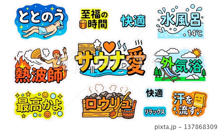 サウナ・サ活のステッカー風イラストセット かわいいサウナ用語のメッセージスタンプ