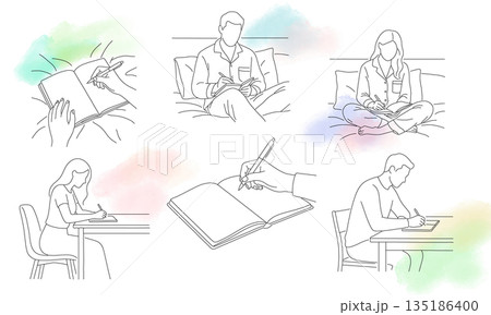 ジャーナリングで思考を整理する手元,机に向かってノートを書く男女,ベッドの上で日記を書く男女