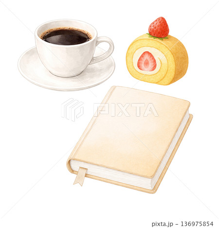 水彩風 コーヒーとケーキとノートのイラスト カフェ 勉強 新生活 切り抜き素材