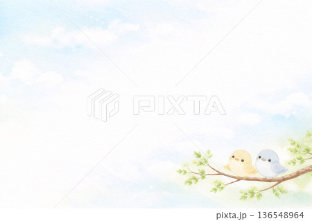 鳥シリーズ:右下の枝にとまる鳥と空のパノラマ背景