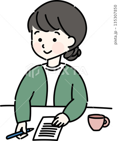 封筒を確認するシニア女性 机で手続きを行う高齢者のイラスト