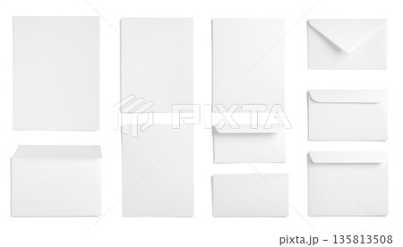 白背景に並んだ白いレターと封筒のセット ミニマル文具モックアップ