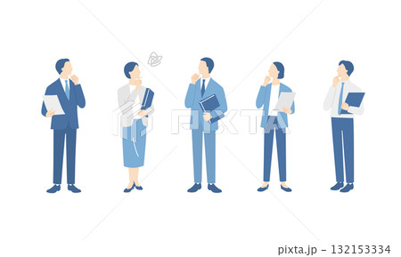 書類ファイルを持って考える、ビジネスチームの全身イラストセット
