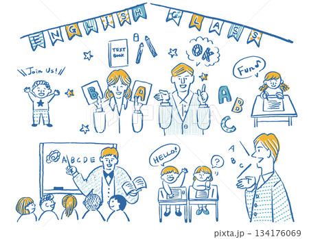 学校で使う道具のセットアイコンと小学生の子どもたちの入学式オシャレな手描きイラストベクター素材