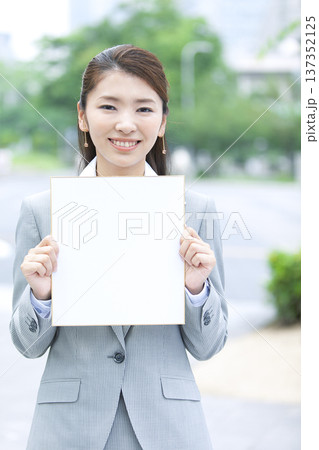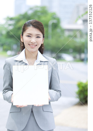 ホワイトボードの前でプレゼンテーションをするスーツ姿の若い日本人女性ビジネスパーソン