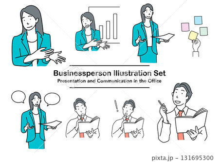 イラスト素材: プレゼンや会話をするビジネスパーソンのオフィスシーンセット