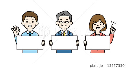 パネルを持って紹介する、社長と若い男女の会社員の上半身ベクターイラスト素材セット_カラー