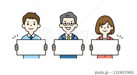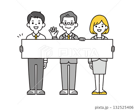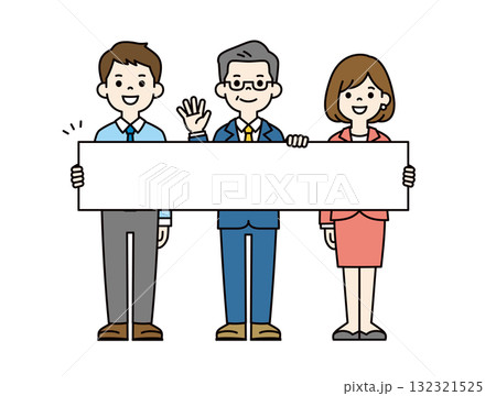 横長の看板を持って案内する、様々な年齢の会社員の全身ベクターイラスト素材セット_カラー