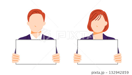 白いフリップを持って案内する、若い会社員の男女のシンプルな全身ベクターイラスト素材_カラー