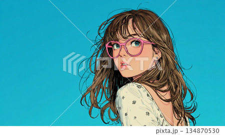 メガネをかけたポップでかわいい女性のイラスト(生成AI)