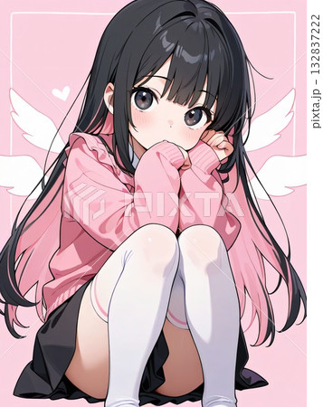 アニメ風 ピンクヘア女性 笑顔 カジュアル 白背景 イラスト
