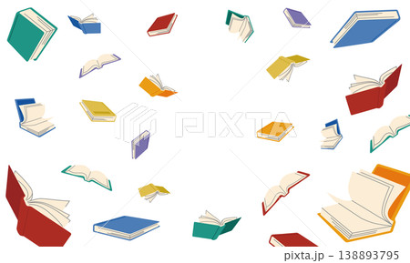 本と書籍と紙ページがランダムにたくさん舞うカラフルな背景ベクターフレーム余白有り