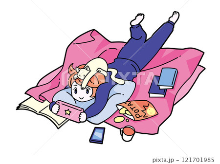 スマホをいじる女子のイラスト背景無・雑誌有・人物中央・カメラ目線版