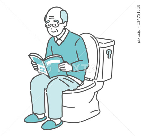 トイレで本を読む高齢男性のイラスト(読書・長居・痔の原因)